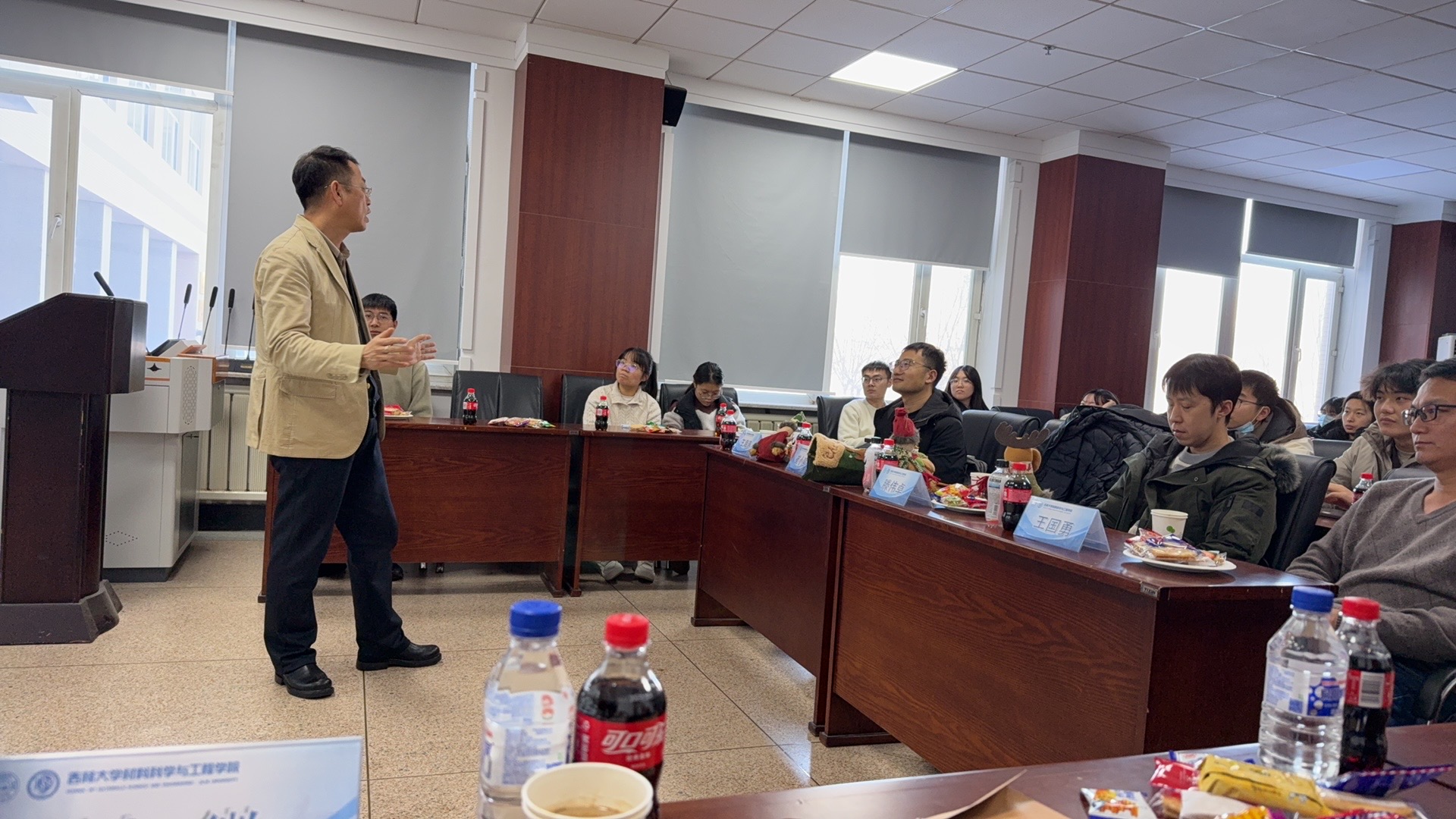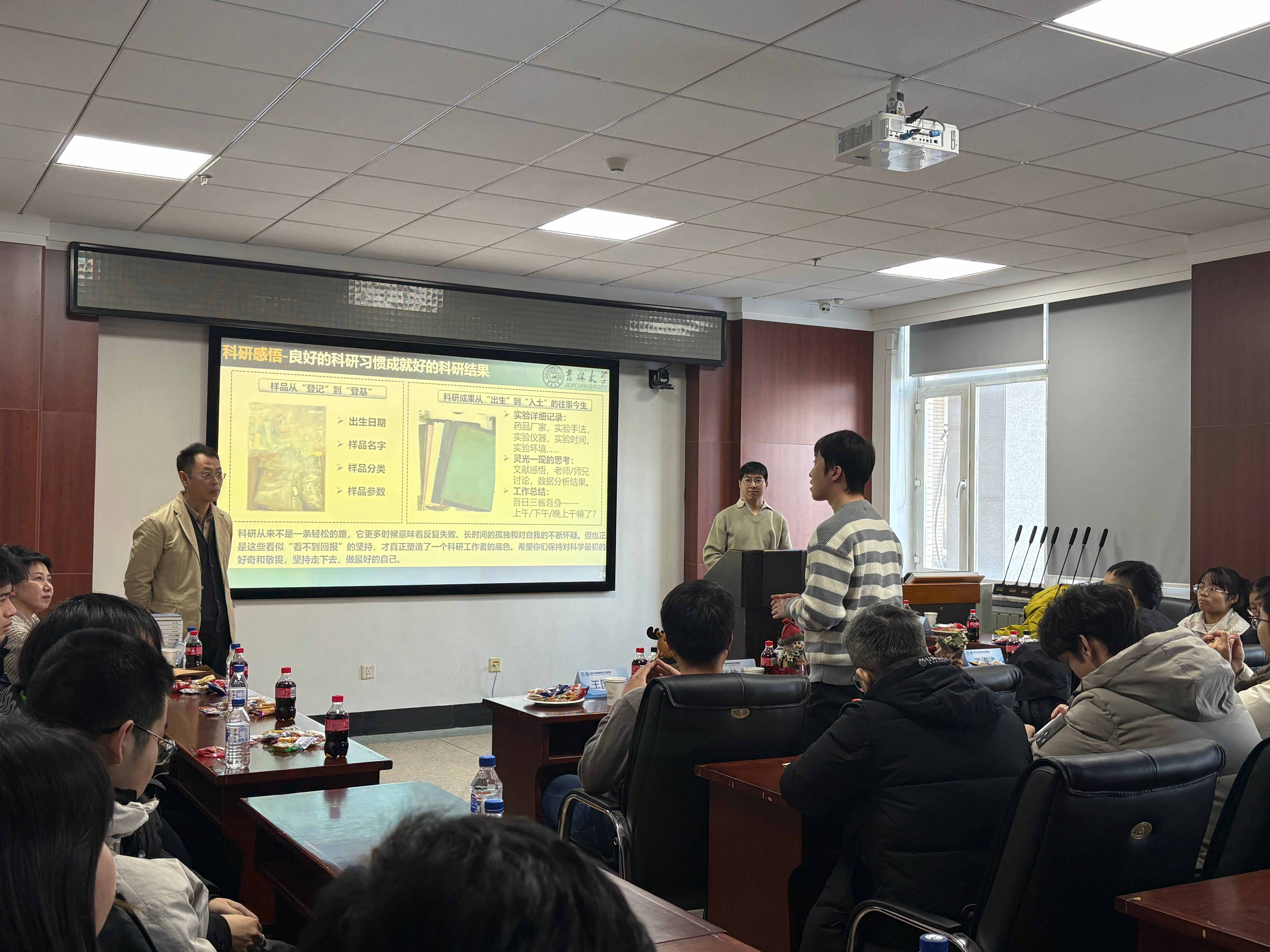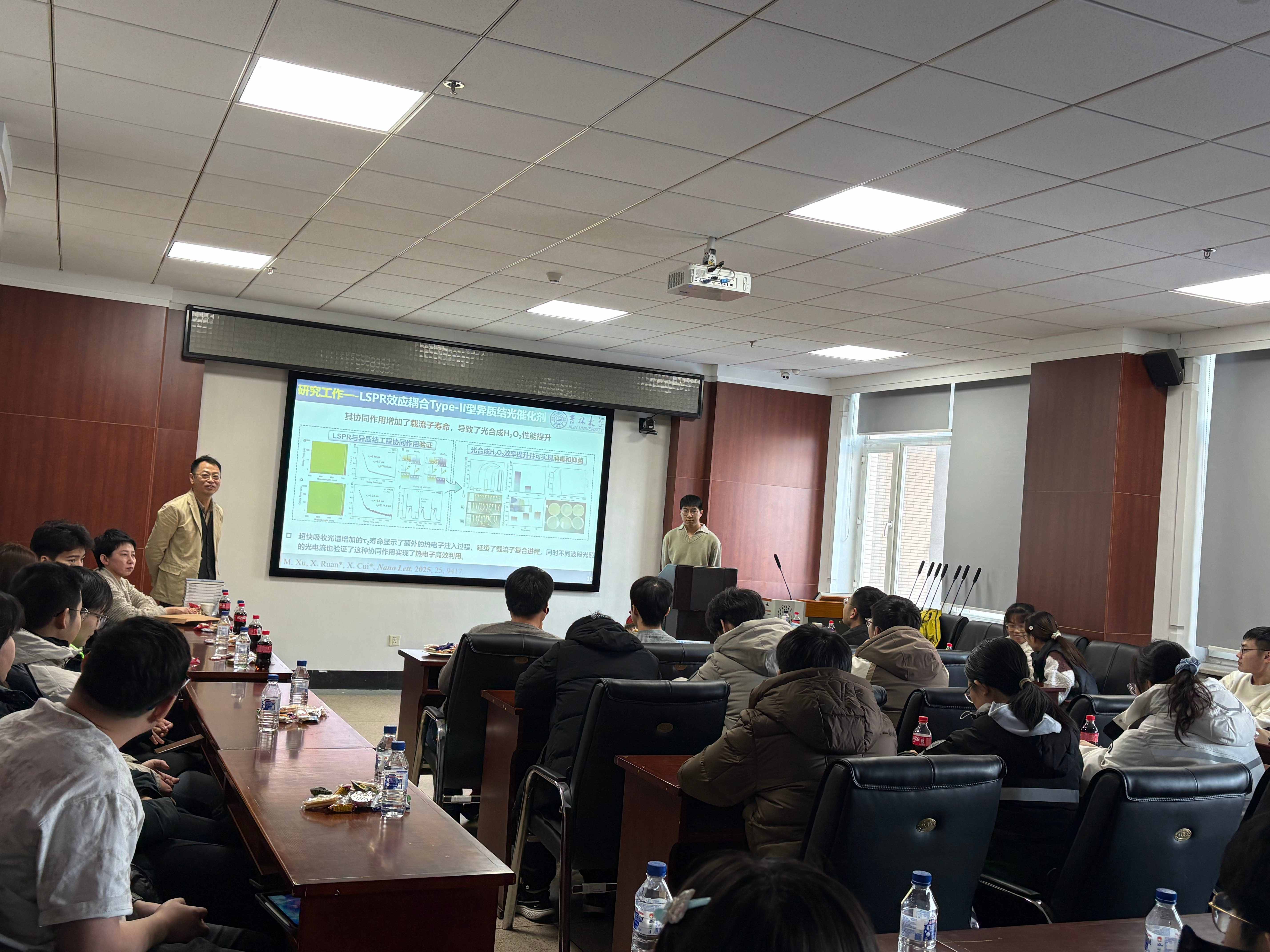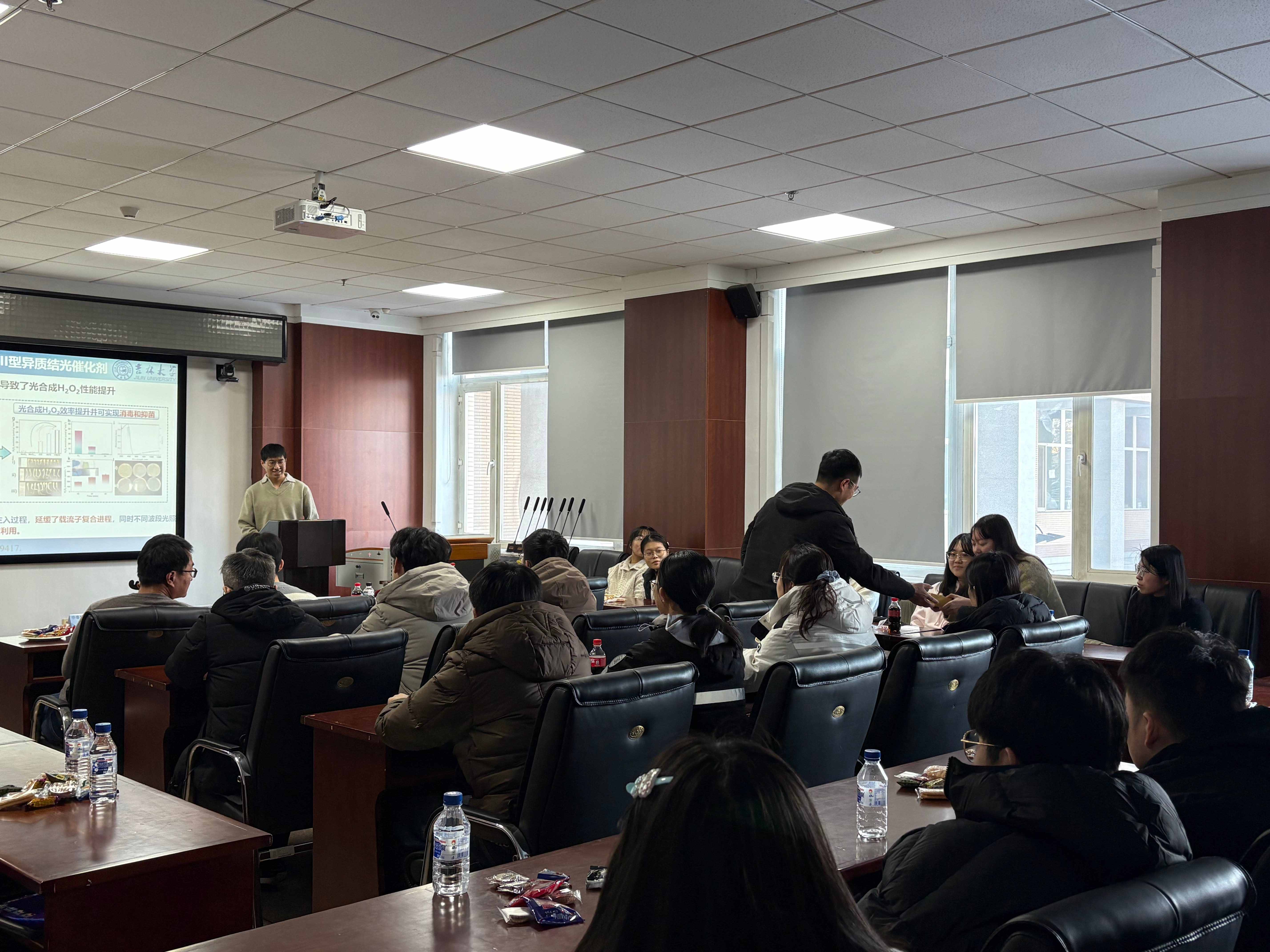 本次学术沙龙也邀请到材料学院材料物理与化学方向研究生工作负责人王海涛教授及材料学方向研究生工作负责人王国勇教授。二位教授分别从学科发展与研究生培养的角度出发,对本次活动的学术价值与组织形式给予了积极评价。此外活动期间,王海涛老师特别为现场师生准备了糖果与苹果,增进了交流互动的温馨氛围。各位老师的到来与支持,进一步增强了活动的师生凝聚力,充分展现了学院对学术交流与人才培养的高度重视。在本期学术沙龙中,许明华同学进行了内容详实、富有启发性的科研汇报,崔小强老师随后围绕报告内容作了专业细致的点评,并结合自身研究方向提供了延伸性的学术建议。参会同学在拓宽学术视野的同时,也获得了科研方法与思路上的切实启发。